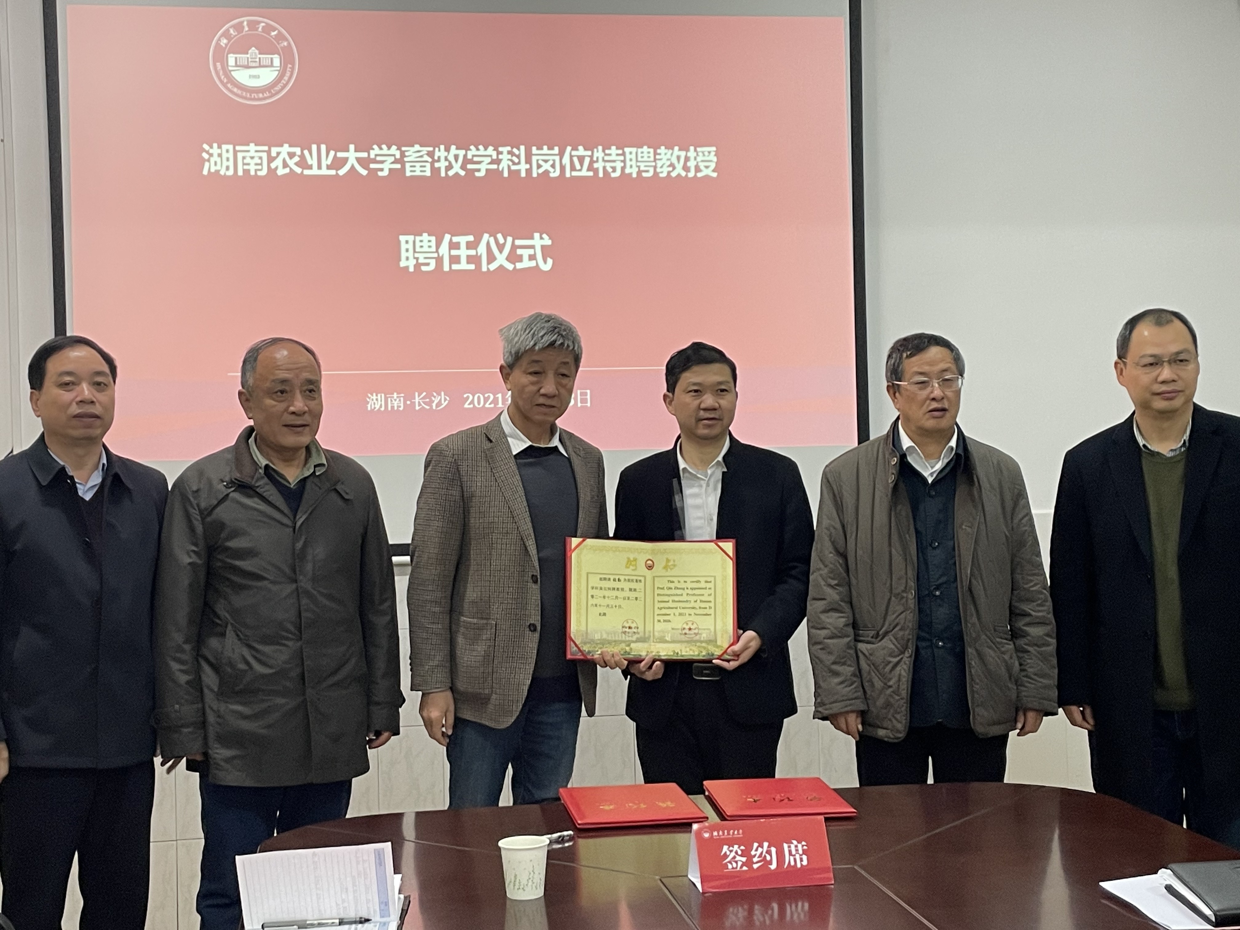 聘任仪式上贺喜院长代表太阳成tyc33455cc与张勤教授签订聘任合同,人事处伍小松处长代表学校向张勤教授颁发聘书。贺喜院长介绍了张勤教授的主要业绩及学院聘任张教授的初衷,张勤教授的引进是在助推岳麓山畜禽种业创新中心建设、对接印遇龙院士动物遗传育种方向国家项目实施及加强畜牧学科动物遗传育种方向团队建设的背景下进行。