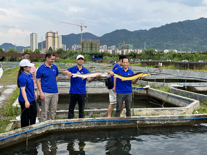 在东江湖库区管理局李龙球局长的介绍下,博士团师生先后走访调研了资兴市良美鲟龙鱼特种水产苗种繁育基地、资兴市智慧立体渔业特色养殖产业基地和资兴市湖源渔业公司养殖基地。了解到鲟龙鱼的养殖作为资兴市内陆养殖渔业的重要组成部分,在东江湖渔业产业转型升级和绿色化、生态化的发展中发挥着重要作用。