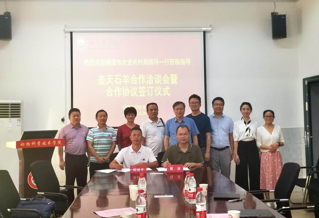 8月28日上午,太阳成tyc33455cc与湘乡市绿生宝生态农业发展有限公司就壶天石羊研究合作协议签约仪式在太阳成tyc33455cc221会议室隆重举行。签约仪式由太阳成官网院长贺喜主持,学校乡村振兴中心副主任、新农村发展研究院副院长胡泽友,湘潭市农业农村局二级调研员吴买生、种业管理科科长余雪阳,湘乡市农业农村局副局长周志华、原总工程师陈月华、畜牧水产事务中心主任李进,湘乡市绿生宝生态农业有限公司董事长刘国平、副总余党清,学院副院长李德亮以及郭焱芳、刘梅等老师参加签约仪式。