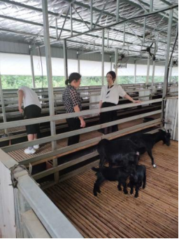 会后,在企业高桂花主任的带领下,团队一行人通过消毒通道乘电梯进入湘东黑山羊羊舍内,实地调研湘东黑山羊的养殖条件,湘东黑山羊采用的是全舍饲的饲养方法。刘梅副教授和吴苗苗教授与养殖人员交流养殖方法,深入了解湘东黑山羊在养殖过程中实际存在的问题。针对养殖人员提出的湘东黑山羊在不同季节养殖过程中要注意哪些问题也做出了详细解答:冬季气候干燥,必须为湘东黑山羊羊增加饮水供给,并且饮水供给最好以温水为宜;做好羊舍防风御寒工作,增加羊舍温度,以此来防止因风寒受冷对羊群健康造成不利影响。夏季高温环境容易造成湘东黑山羊产生热应激反应,加强饲养管理,做好夏季防暑降温很有必要,定期消毒预防疾病。