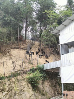 刘国平夫妇向大家详细介绍了壶天石羊保种场的基本情况以及实际养殖中存在的问题,刘梅副教授和吴苗苗教授也就保种场存在的问题一一提出了解决方案,在刘国平夫妇的带领下,大家有序进入了羊舍内与壶天石羊进行了近距离地接触,实地考察了保种场壶天石羊的养殖环境——半舍饲半放牧的饲养环境。羊舍内采用了镂空地板,羊舍侧面连接了后山,壶天石羊白天可以通过连桥去到后山活动,夜间再回到羊舍休息。