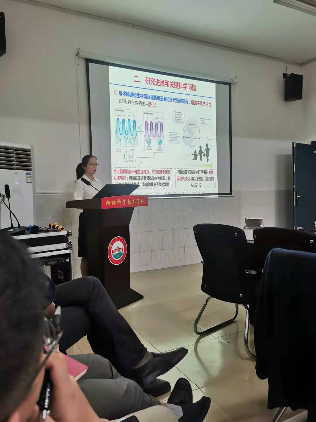主持人对三位报告教授进行了介绍,对三位教授的表示热烈的欢迎。会上,肖调义教授以“草鱼抗GCRV主效功能分子筛选及其遗传机制解析”进行了报告,谭碧娥教授以“基于肠道微生物研究宁乡猪母体对粗饲料的利用及其影响后代肠道发育的机制”为题作为主讲人,黄兴国教授以题为“影响宁乡猪脂质代谢的肠道关键微生物挖掘及其作用机制研究”作了详细地汇报。会上肖调义教授对目前GCRV研究进展、GCRV的遗传机制进行了介绍,谭碧娥教授对肠道发育的机制进行了详细地介绍,黄兴国教授对宁乡猪脂质代谢进行了介绍。会后同学们纷纷热情的向老师提问、交流学习。在教授们的耐心解答下,同学们纷纷表示收货颇多。