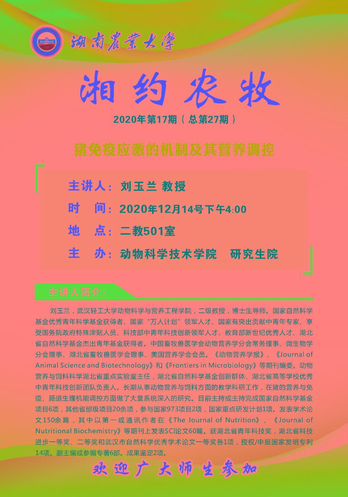 报告人简介: 刘玉兰,武汉轻工大学动物科学与营养工程学院,二级教授,博士生导师。国家自然科学基金优秀青年科学基金获得者、国家“万人计划〞领军人才、国家有突出贡献中青年专家、享受国务院政府特殊津贴人员、科技部中青年科技创新领军人才、教育部新世纪优秀人才、湖北省自然科学基金杰出青年基金获得者。中国畜牧兽医学会动物营养学分会常务理事、微生物学分会理事、湖北省童牧兽医学会理事、美国营养学会会员。《动物营养学报》《Journal of Animal Science and Biotechnology》 和《Frontiers in Microbiology》 等期刊编委。动物营养与饲料科学湖北省重点实验室主任,湖北省自然科学基金创新群体、湖北省高等学校优秀中青年科技创新团队负责人。长期从事动物营养与饲料方 面的教学科研工作,在猪的营养与免疫、肠道生理机能调控方面做了大量系统深入的研究。目前主持或主持完成国家自然科学基金项目6项,其他省部级项目20余项,参与国家973项目2项,国家重点研发计划1项。发表学术论文150余篇,其中以第一或通讯作者在 《The Journal of Nutritions》《Journal of Nutritional Biochemistry》等期刊上发表SCI论文60篇。