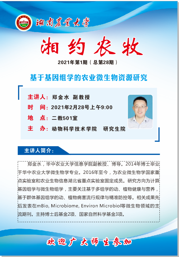 报告人简介: 郑金永,华中农业大学信息学院副教授、博导。2014年博士毕业于华中农业大学微生物学专业。2016年至今,为农业微生物学国家重点实验室和农业生物信息湖北省重点实验室固定成员。研究方向为计基因组学与微生物组学,主要关注基于多组学的动、植物健康与营养,甚于群体基因组学的动、植物病害流行规律与精准防控等。相关成果先后发表在mBio, Microbiome, Environ Microbiol等微生物领域的主流期刊。主持博士后基金2项、国家自然科学基金3项。